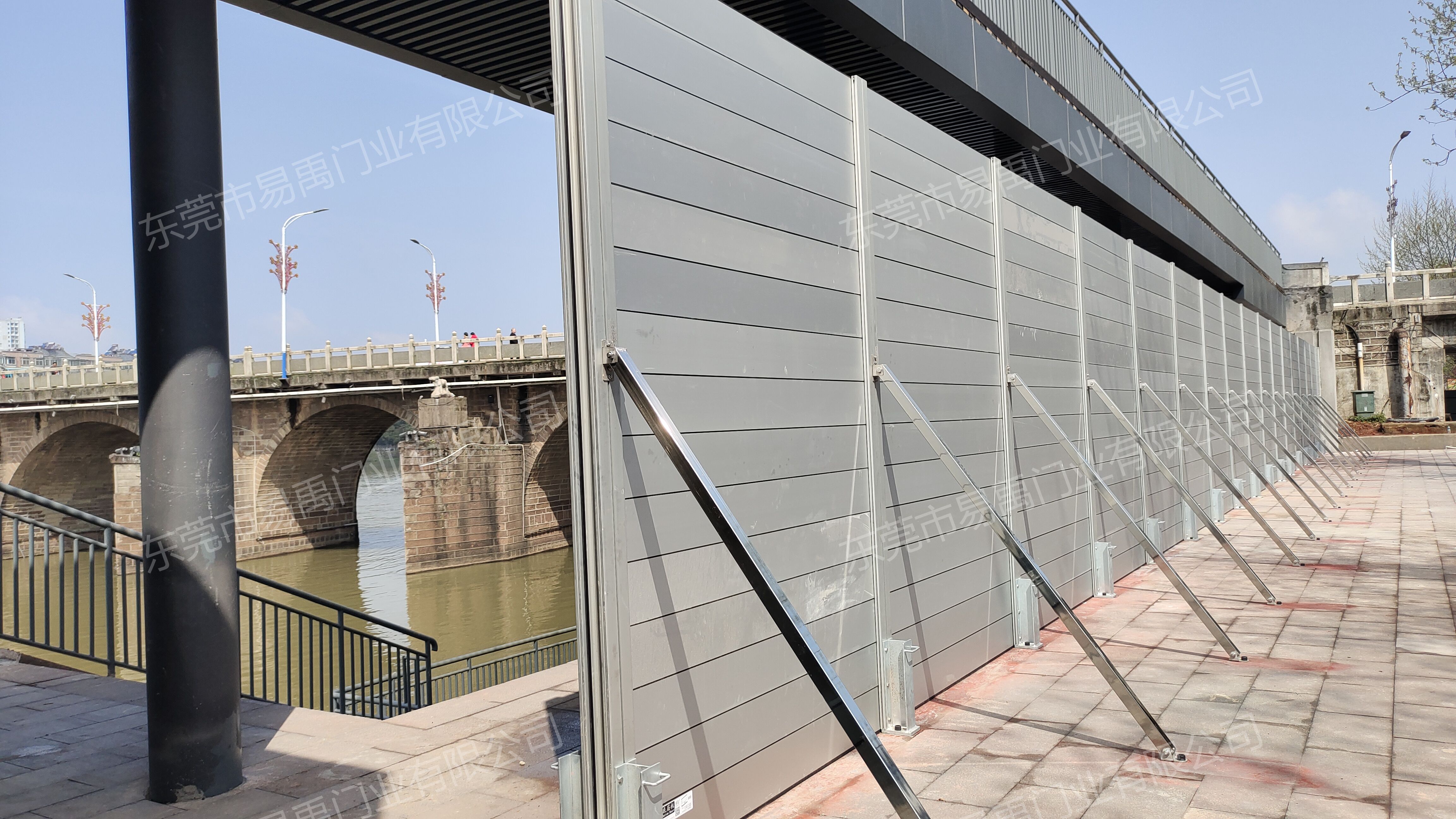 汛期來臨時(shí)只需取出儲(chǔ)存的立柱、擋板和下壓件即可安裝擋水板,擋水板通體使用鋁合金材質(zhì),三人操作一段只需兩分鐘,可以做到方便、快捷、輕便。